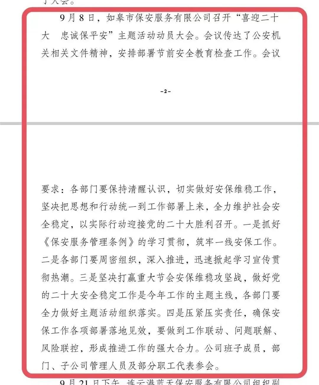 二十大召開前期,保安公司根據(jù)如皋市公安局黨委要求和富皋萬(wàn)泰集團(tuán)黨委工作部署,開展了“喜迎二十大,保安護(hù)平安”主題系列活動(dòng),作為如皋市日常社會(huì)管理的重要輔助力量,保安公司再次彰顯了社會(huì)責(zé)任擔(dān)當(dāng)、科學(xué)規(guī)范管理、高效迅捷的執(zhí)行力,此次活動(dòng)受到江蘇省保安協(xié)會(huì)的肯定。