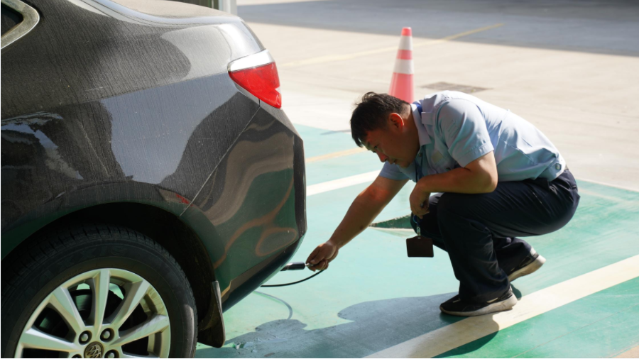 尾氣檢測繁重艱苦,檢測站設有4條尾氣檢測線,根據不同車型,必須適時搬動調整分析儀器,工序繁瑣、勞累。尾氣檢測員陸軍、吳范冰毫無怨言,保證檢測結果準確性、防止尾氣超標車輛上路是他們的職責。
