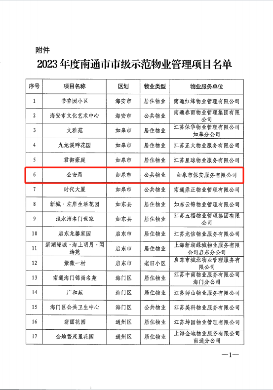 近日,南通市住房和城鄉(xiāng)建設(shè)局發(fā)布了《關(guān)于公布2023年度市級(jí)示范物業(yè)管理項(xiàng)目名單的通知》,如皋市保安公司承接的公安局項(xiàng)目憑借標(biāo)準(zhǔn)化物業(yè)服務(wù)脫穎而出,被評(píng)為“2023年度南通市市級(jí)示范物業(yè)管理項(xiàng)目”。